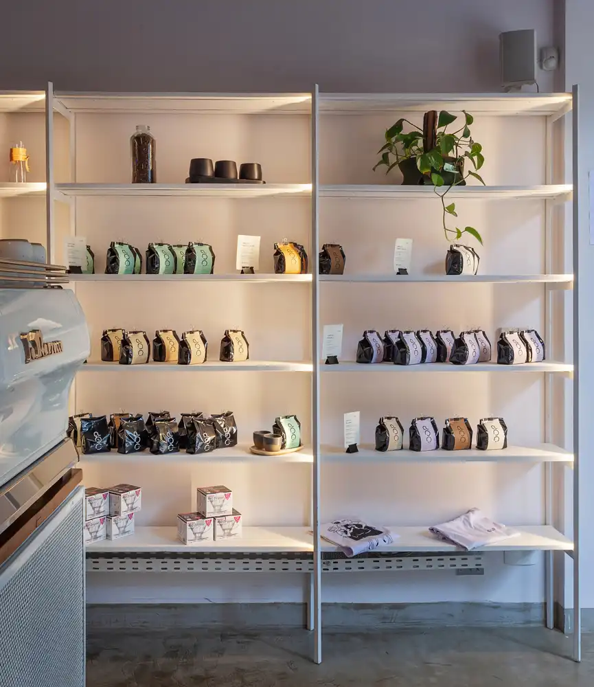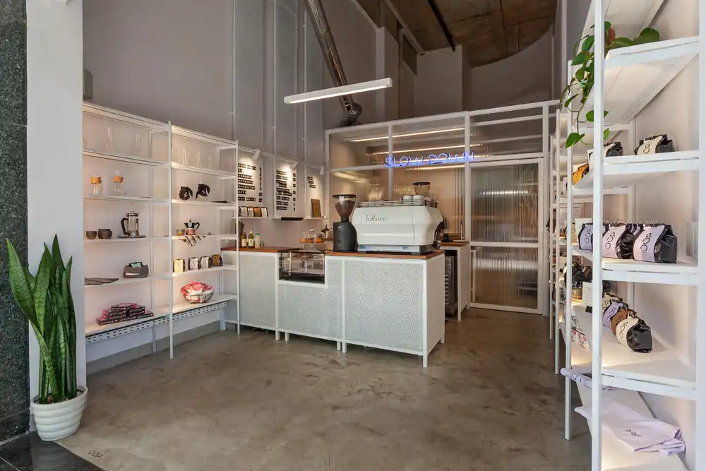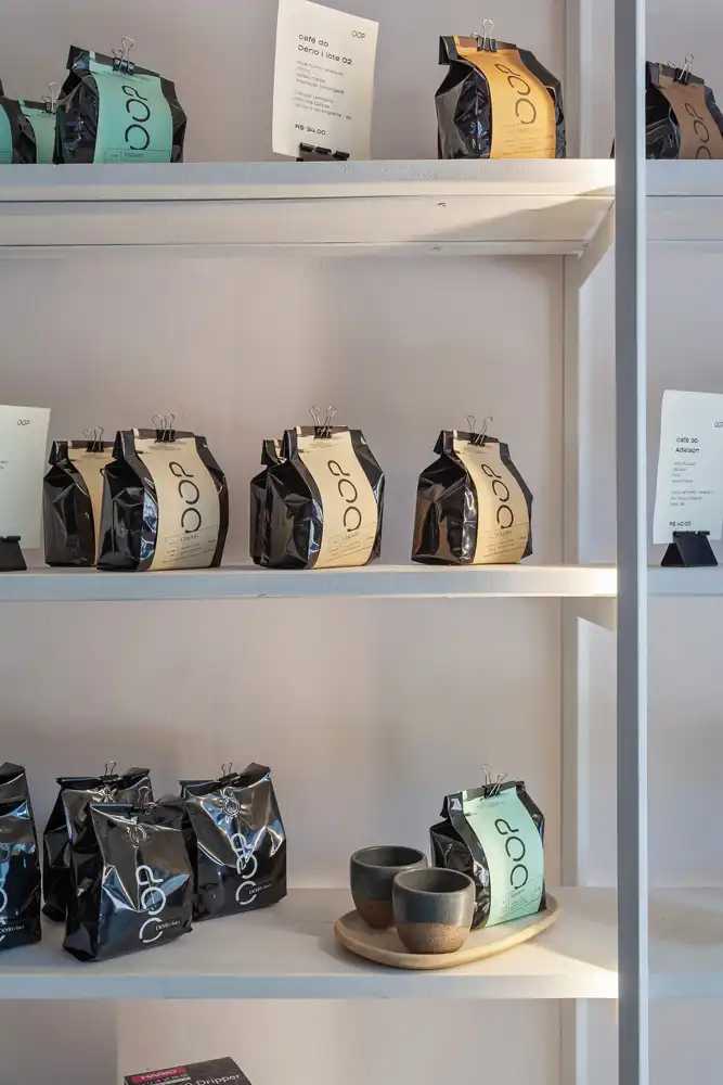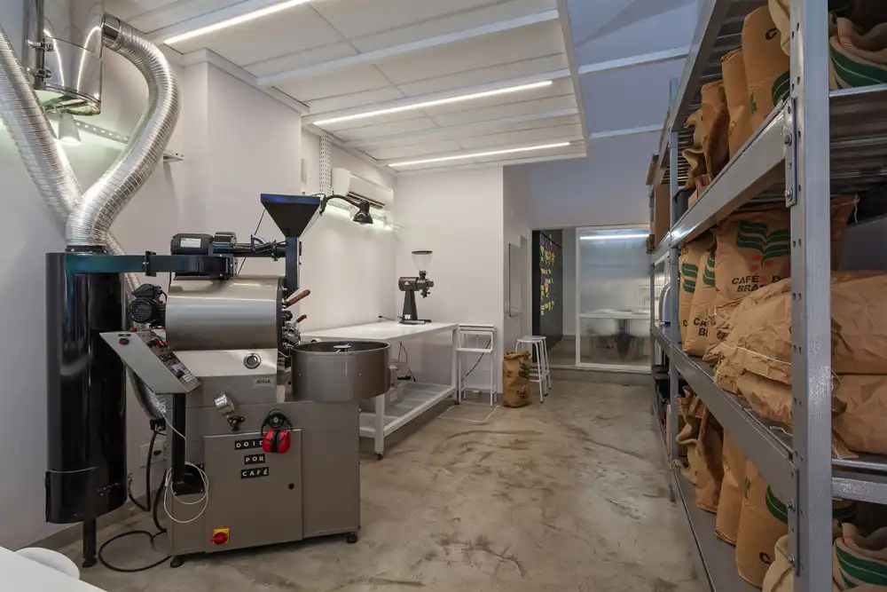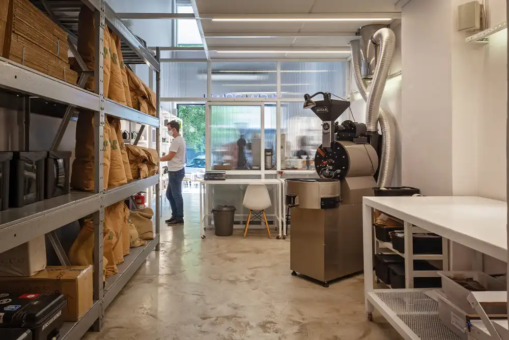 Desde a concepção original, o consumo do café especial sempre foi o protagonista do projeto. Na reforma, esse protagonismo se amplia para além da xícara, trazendo os processos anteriores ao consumo para o centro da experiência. Parte significativa da loja passa a abrigar a torrefação e o escritório do OOP, aproximando o cliente das etapas de produção e reforçando a transparência do fazer.