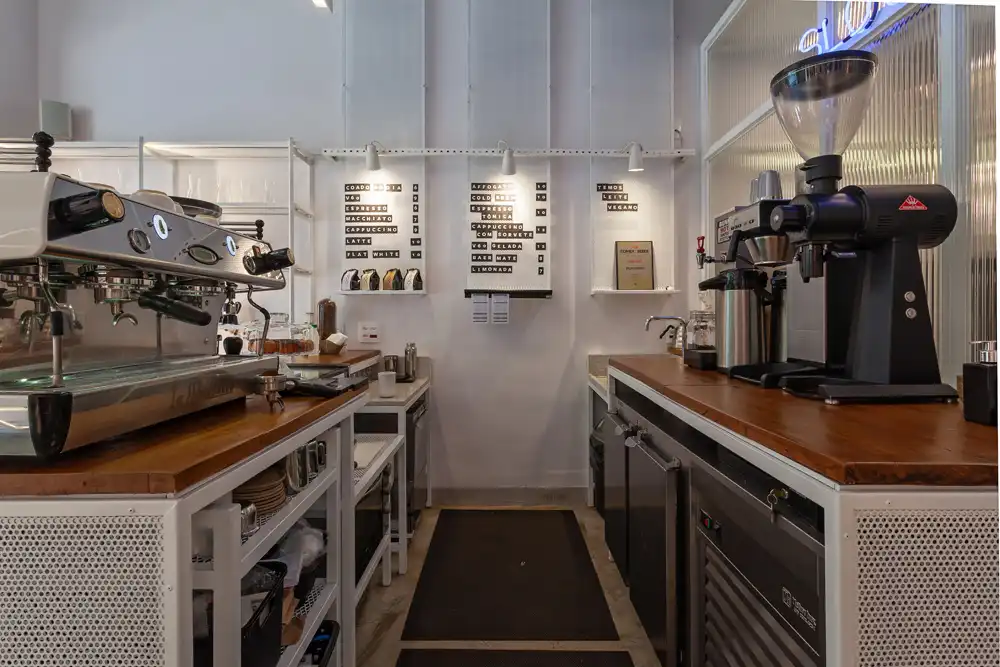 Os espaços destinados ao consumo são deslocados para a calçada, aproveitando a ampla área pública existente em frente à loja e fortalecendo a relação com a cidade. Além do café para consumo imediato, o projeto incorpora a venda de café para levar, consolidando o espaço como um ponto de produção, consumo e convivência urbana, onde arquitetura e processo caminham juntos.